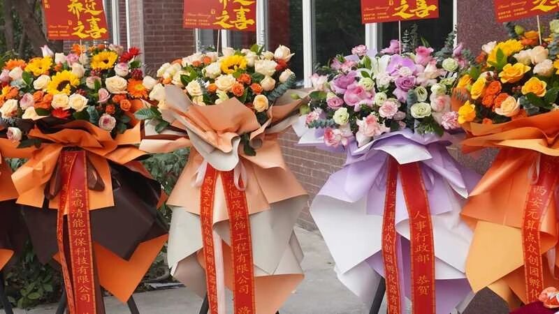 上午吉时,仪式现场花团锦簇,喜庆祥和。西安元算点众创园孵化器有限公司郑总、许总、集团公司各部门负责人及全体员工齐聚一堂,共同见证这一重要时刻。多家合作公司代表也专程到场祝贺,并进献花篮表达美好祝愿。
